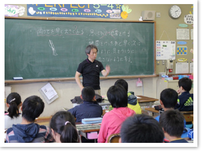 5年4組で行われた、牛村教授による授業テーマ「50m走のタイムを縮めよう」では、実演を交えてわかりやすく説明され、子どもたちも夢中になって聞き入っていました。