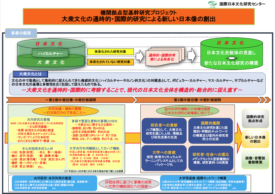 日文研は、第3期中期目標・中期計画において基幹研究プロジェクト「大衆文化の通時的・国際的研究による新しい日本像の創出」に重点的に取り組み、新たな日本文化研究の国際的研究拠点の構築を志向する。この事業を通じて、本来の最重要業務の一つである「海外の日本研究者への研究協力」をさらに充実させ、日本研究の国際的中核拠点としての機能を強化しながら、国内における「国際日本研究」コンソーシアムを形成する。機関拠点型基幹研究プロジェクト