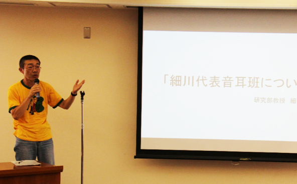 懇談会では荒木広報委員長による司会のもと、所長の挨拶に続き、新任教員・外国人研究員の紹介、磯前研究協力委員会委員長から活動報告、所員の研究紹介として細川教授から「細川代表音耳(おとみみ)班について」と題して、これからの研究についての紹介がありました。