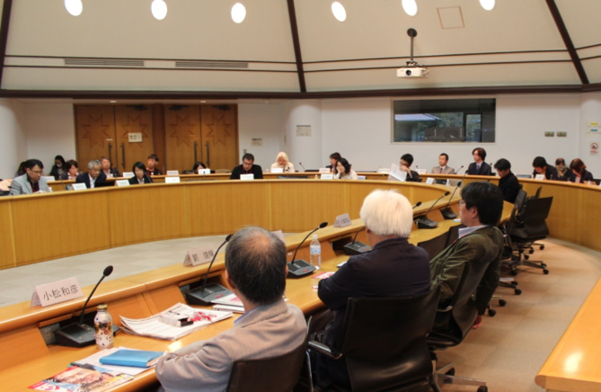 小松和彦所長の挨拶の後、「古代・中世」「近世」「近代」「現代」の時代区分に対応する4つの研究班から、それぞれの研究方針や研究テーマ、今後の展望などについて発表が行われました。各班の発表に対しては、研究班の枠を越えた活発な質疑応答や問題提起が行われ、研究プロジェクト全体としての研究手法や今後の展望についても議論が深められました。
