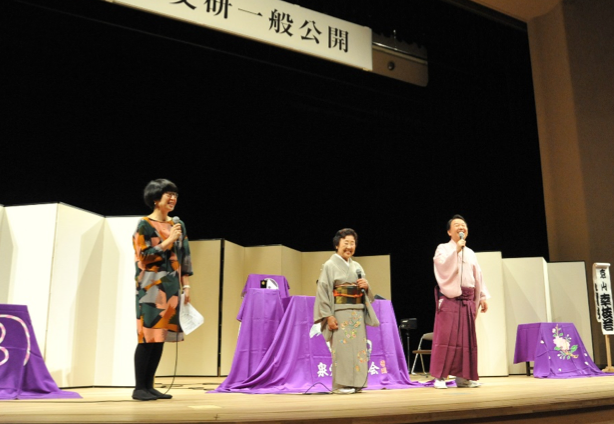 講堂では、午前に「日文研データベースで遊ぼう」と題し、若手教員によるデータベースの紹介や座談会が行われました。午後は「浪曲を聴く会」と題し、二代目京山幸枝若師と京山小圓嬢師による名人会を開催するとともに、日文研の浪曲SPレコードコレクションや、大衆文化研究における浪曲の位置づけなどが紹介され、来場者は熱心に耳を傾けていました。