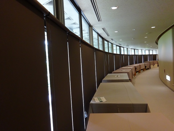 環境管理- 講堂に日よけ用のスクリーンを設置しました。毎年の一般公開時の展示スペースとして使用していた講堂のホワイエには日よけ設備がありませんでしたので、毎年、遮光対策設置に手間がかかっていました。今回、日よけスクリーンが設置されたことによって、展示会場設営の手間を大幅に省力化することができました。