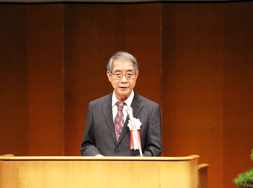 引き続き開催された記念式典では、立本成文人間文化研究機構長、小松和彦日文研所長が挨拶を行ったのち、松野博一文部科学大臣(代読:小松親次郎文部科学審議官)および門川大作京都市長が祝辞を述べました。その後、北出猛夫管理部長から祝電の披露を行い、会場は祝賀ムードに包まれました。