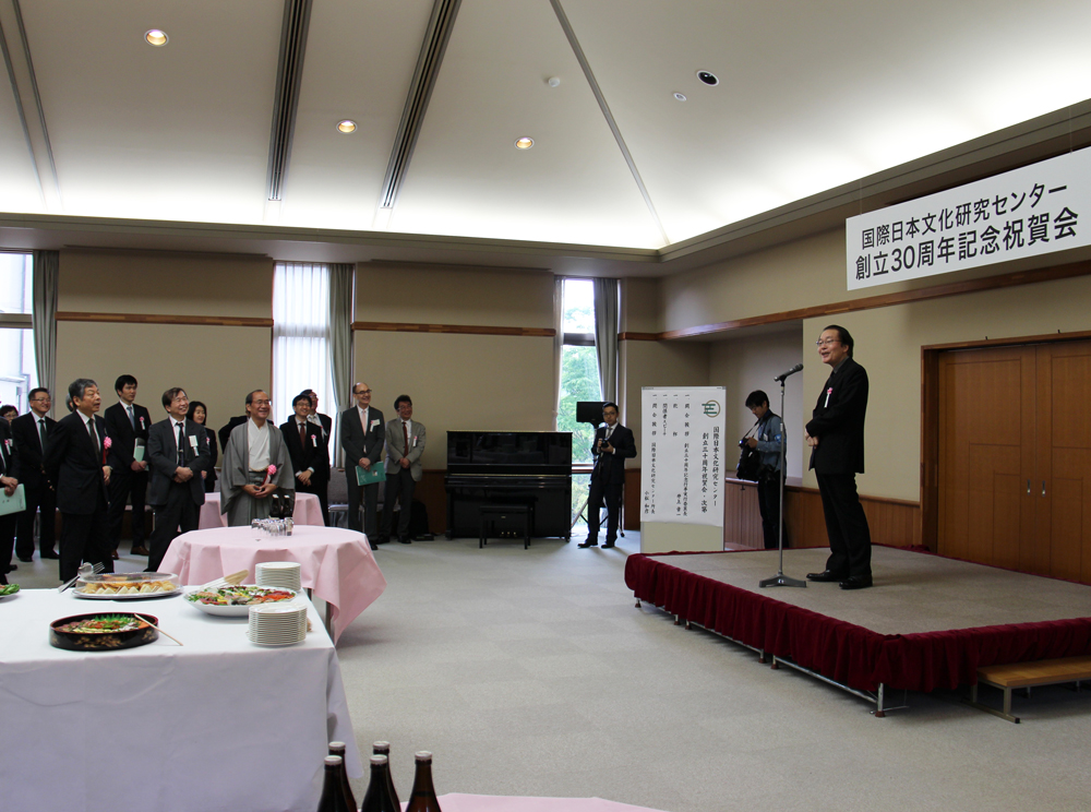 その後の祝賀会では、井上章一教授(創立30周年記念事業実行委員長)の開会挨拶に続き、安成哲三総合地球環境学研究所長が乾杯の発声を行いました。歓談中には山田啓二京都府知事や吉田憲司国立民族学博物館長などが創立30周年を祝うスピーチを行い、会場となったさつきホールは多くの日文研関係者で賑わいました。