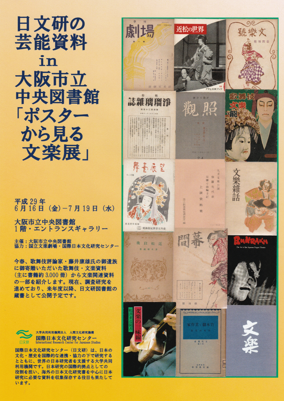 2017年6月16日(金)〜7月19日(水) 大阪市立中央図書館「ポスターから見る文楽」展にて、日文研の文楽関係資料(明治期以降の書籍35点)が展示されます。大阪市立中央図書館 公式ページ