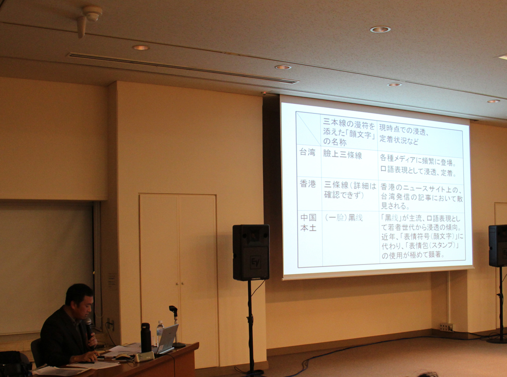 「臉上三條線」(中国本土では「一脸黑线」)は、中国本土以外で用いられている標準中国語を含めた華語において、主にインターネット記事の転載などを通じて浸透し、一般化しています。これはマンガでよく用いられる顔に縦線を入れ、なんとも言えない気持ちを現した表現手法が言語化されたものです。今回は非言語情報による意思の疎通を重んじる日本言語文化の土壌で培われたマンガの表現手法が、中国語圏における表現形式に与える影響について「臉上三條線」を例に、小園晃司機関研究員が発表を行いました。