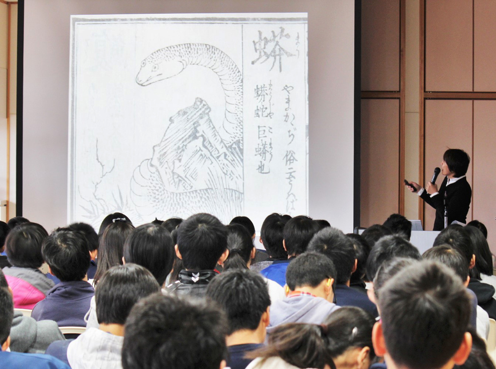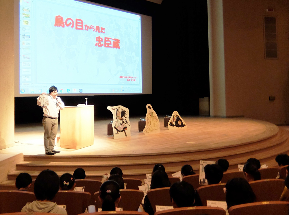 日文研の地域連携活動の一つとして、小学生にも日文研の研究活動の一端に触れてもらうため、10月から11月にかけて、近隣の京都市立桂坂小学校で出前授業を実施しました。この授業は毎年実施しており、今年で22回目となります。今回は、専任教員や外国人研究員など計5名が、児童に関心を持ってもらえるような授業テーマを用意し、5年生対象の「出前授業」は日文研の講堂にて、4クラス合同の授業を1コマ、6年生対象の「出前授業」は桂坂小学校にて、4クラス合同の授業を4コマ、行いました。