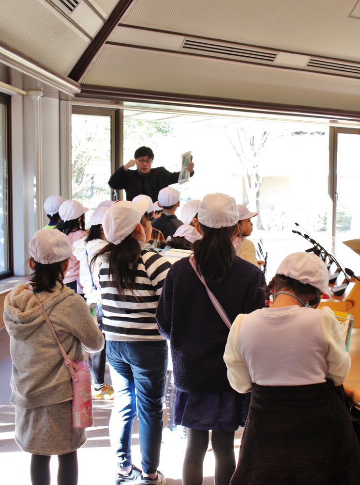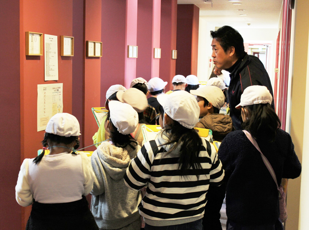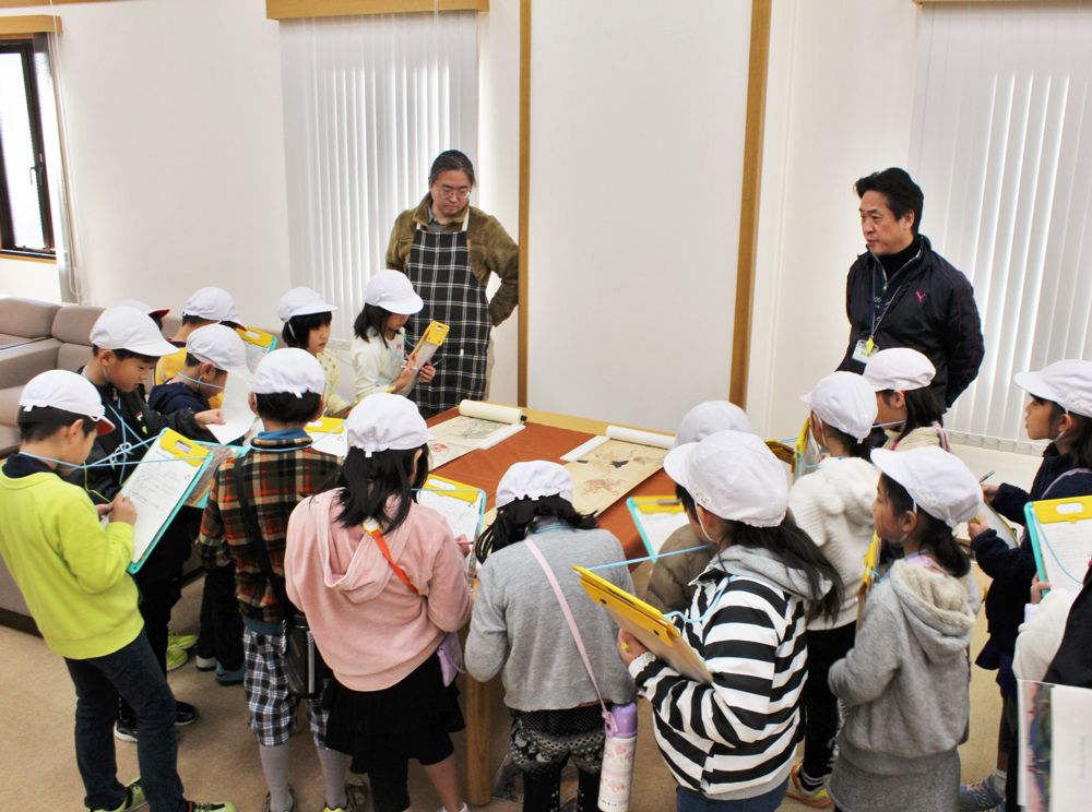 その後、実際に施設内を歩いて見学した時には、荒木教授と児童のあいだで、活発に質疑応答が繰り広げられる場面もありました。また、図書館では、熱心に絵巻物を観察する児童たちの姿が見られました。