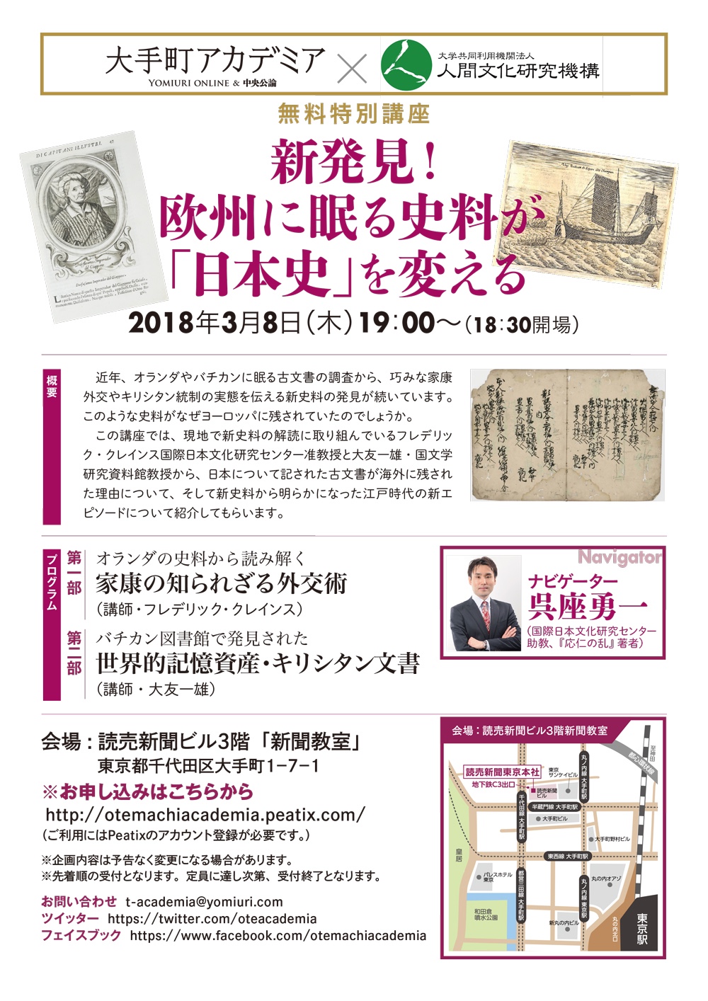 人間文化研究機構特別協力・「大手町アカデミア」(主催:読売新聞東京本社 運営協力:中央公論新社)無料特別講座「新発見!欧州に眠る史料が「日本史」を変える」が、読売新聞ビル3階「新聞教室」(東京都千代田区大手町1-7-1)にて開催されます。日文研からは、講師としてフレデリック・クレインス准教授、ナビゲーターとして呉座勇一助教が参加します。
