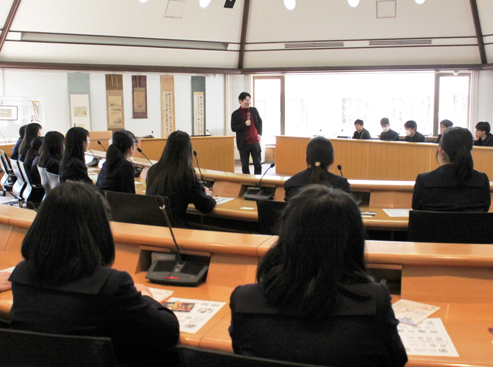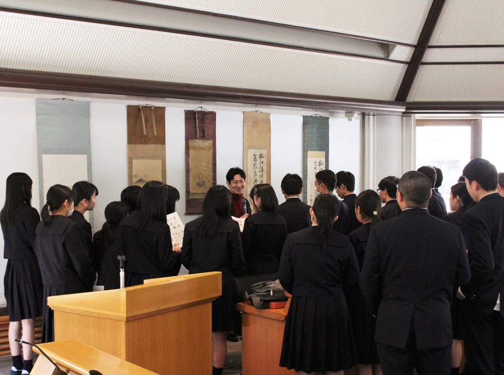 去る3月14日(水)に岡山県立岡山大安寺中等教育学校4年生の生徒42人が、日本文化に対して興味・関心を持ち、広い視野で理解を深めることを目的に、国際日本文化研究センター(日文研)に来所されました。日文研の施設や研究活動等について映像での紹介があり、続いて、磯田道史准教授から、掛け軸を用いてのミニ講義が行われました。