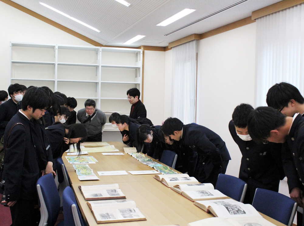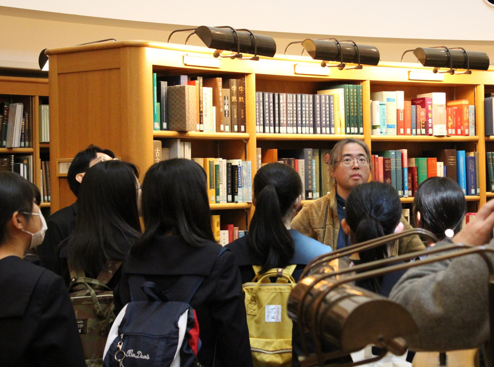 実際に施設内を歩いて見学した際、図書館では、絵巻物や古地図などの資料を熱心に観察する様子や、普段、講演会等を行っている講堂の設備に驚く生徒たちの姿が見られました。