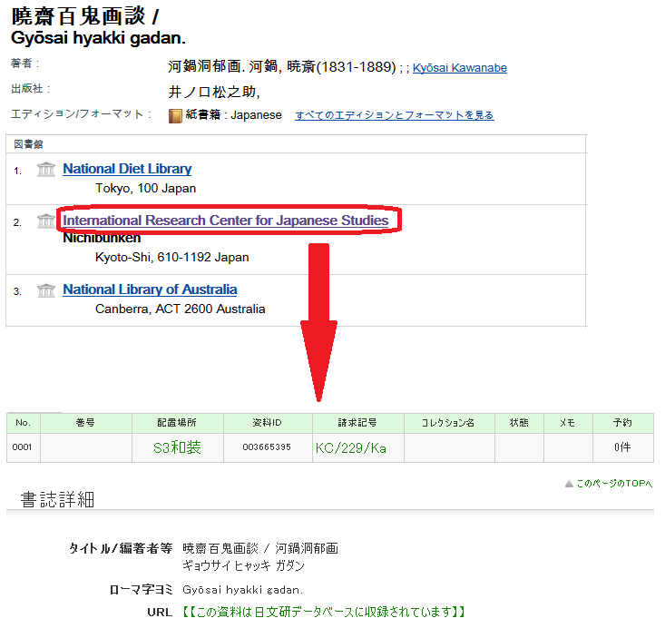 (例)図2:WorldCatを「Gyosai hyakki」で検索→日文研OPACへリンク→日文研データベースへリンク