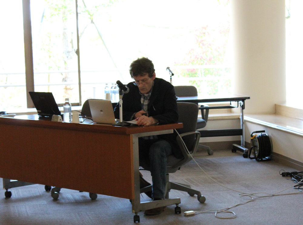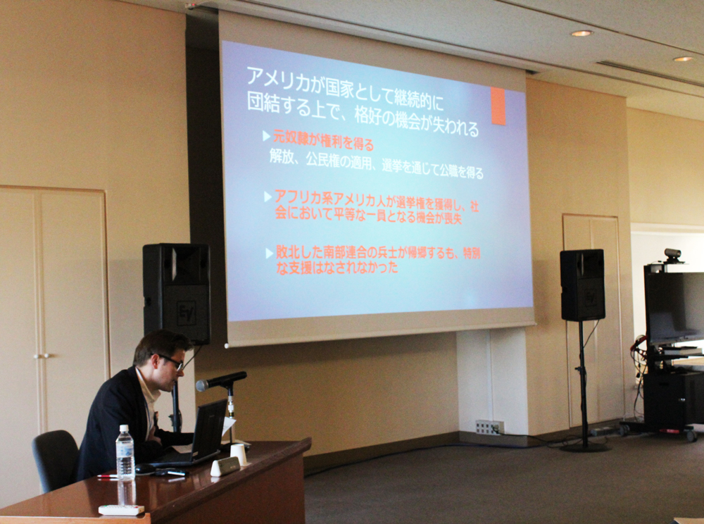 二番手のロバート・ヘリヤー外来研究員は、「世界史における明治維新―内戦の “Postwar” のアメリカと日本を比較する」と題して発表。南北戦争後にレコンストラクション(再建)に取り組んだアメリカ連邦政府がアフリカ系アメリカ人の恒久的な平等の機会を喪失し、いまだに旧体制の名残が継続する結果を招いたのに対し、日本で明治維新がおおむね成功したのはなぜか。一つの要因として、明治政府に敵対していた旧幕臣のエリートを新政府に登用したこと、そしてもう一つのグローバルな要因に、静岡の茶農家として活路を見いだした徳川幕臣により、日本茶が新興産業へと発展した点を指摘しました。