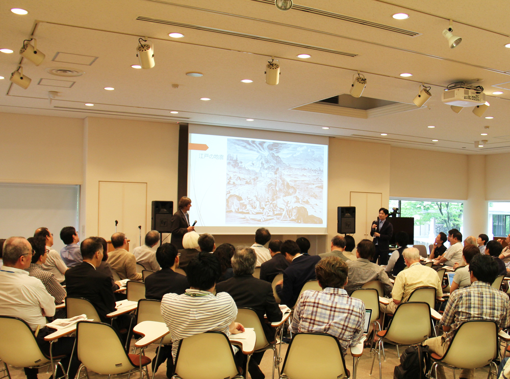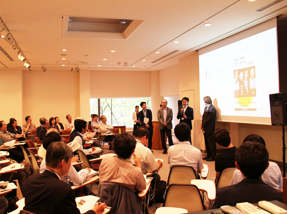 7月4日、報道関係者との懇談会を開催しました。同懇談会は、日文研の研究活動や最新の成果、重点的取り組みなどを紹介して理解を深めてもらうと同時に、広く社会へ情報発信することを目的に年3回開催されています。53回目となる今回は、新聞社、テレビ局、出版社、地域広報等14機関の関係者と、小松和彦所長をはじめとする教職員、計68名が出席しました。新任の関野樹教授ほか、中国・韓国・コロンビアから着任した8名の外国人研究員の紹介に続き、シンポジウムや講演会、「大衆文化研究」プロジェクト等の活動報告が行われました。また、今後の開催予定として「国際日本研究」コンソーシアム主催ワークショップ(7/21)や第3回東アジア日本研究者協議会国際学術大会(10/26~29)等が案内されました。所員の出版物紹介では、近日刊行予定の著作を著者本人がリレー形式で読みどころをPRするという趣向で、参加者の喝采を浴びました。所員の研究紹介では、フレデリック・クレインス准教授が、責任編集を務めて先頃刊行した『日文研所蔵日本関係欧文図書目録第4巻』の概要と特色について、収録図書や画像資料を例に詳しく解説。続いて、磯田道史准教授も日本史家の立場から、欧文図書にしか残っていない日本の貴重な記録が見られる本目録の魅力と利用法についてコメントしました。