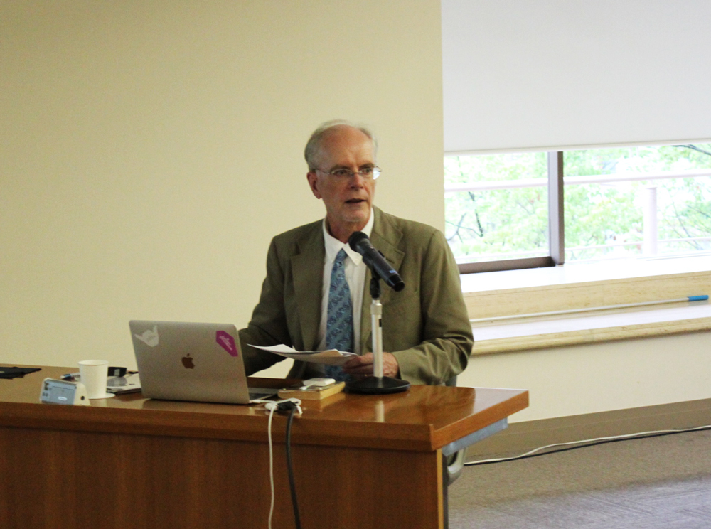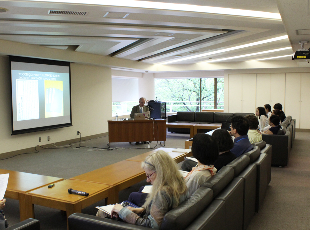 7月5日、ローレンス・マルソー外国人研究員(オークランド大学 日本研究上級講師)を講師に迎え、英語によるイブニングセミナーが開催されました。“Illustrating Aesop: The Tales of Isopo Scrolls and Transformation of the Mediterranean World into the Chinese Visual Field”(イソップの挿絵――『伊曾保物語絵巻』にみる地中海世界から中国的視覚イメージへの変容)と題する発表では、ヨーロッパの版本等と比較しながら、『伊曾保物語絵巻』の図像の特徴について紹介いただきました。