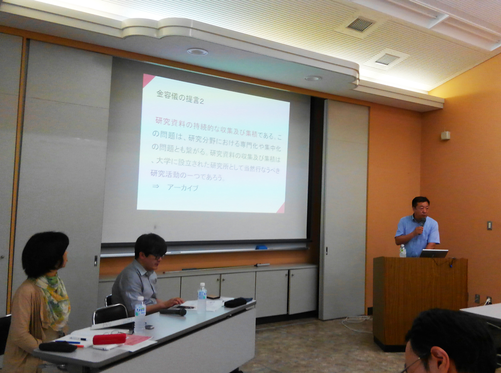 まず、今年3月まで外国人研究員として日文研に滞在していた金容儀氏(韓国・全南大学校教授)による基調講演「韓国における日本研究の現状と展望―柳田国男・沖縄・「日本研究所」」が行われました。全南大学校に着任してから現在まで20年間の研究生活を振り返り、韓国に「乱立」する「日本研究所」の現状と課題を紹介した後、自らの研究テーマである柳田国男の著作と沖縄民俗それぞれについて、最近の研究動向と今後の展望を語りました。
