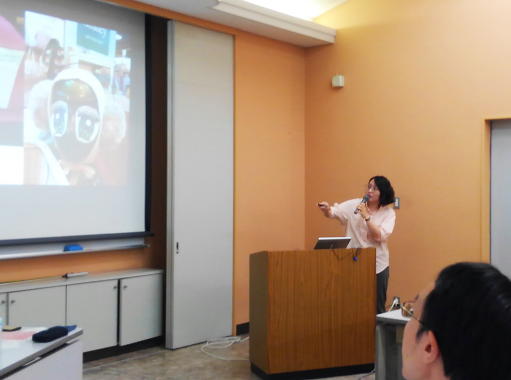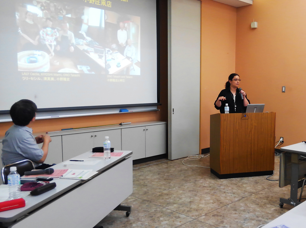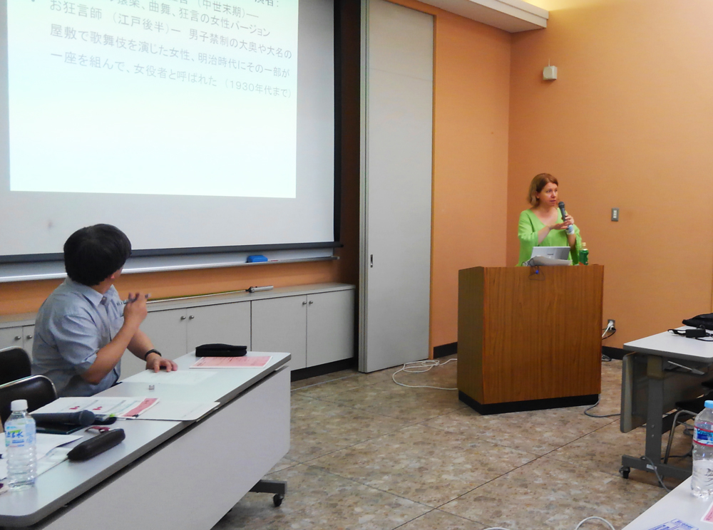 午後の第2部「日本研究の最前線」では、始めにガリア・ペトコヴァ氏(日文研・日本学術振興会研究員)が「日本の伝統芸能におけるジェンダー」と題して、男性中心の伝統芸能の世界においては特異な「おんなもの」ジャンルに焦点をあてました。特に、歌舞伎十八番の一つ「暫(しばらく)」の主役を女性に書き替え、18世紀に初演された「女暫」については、実際の舞台の映像を見せながら詳しく解説しました。