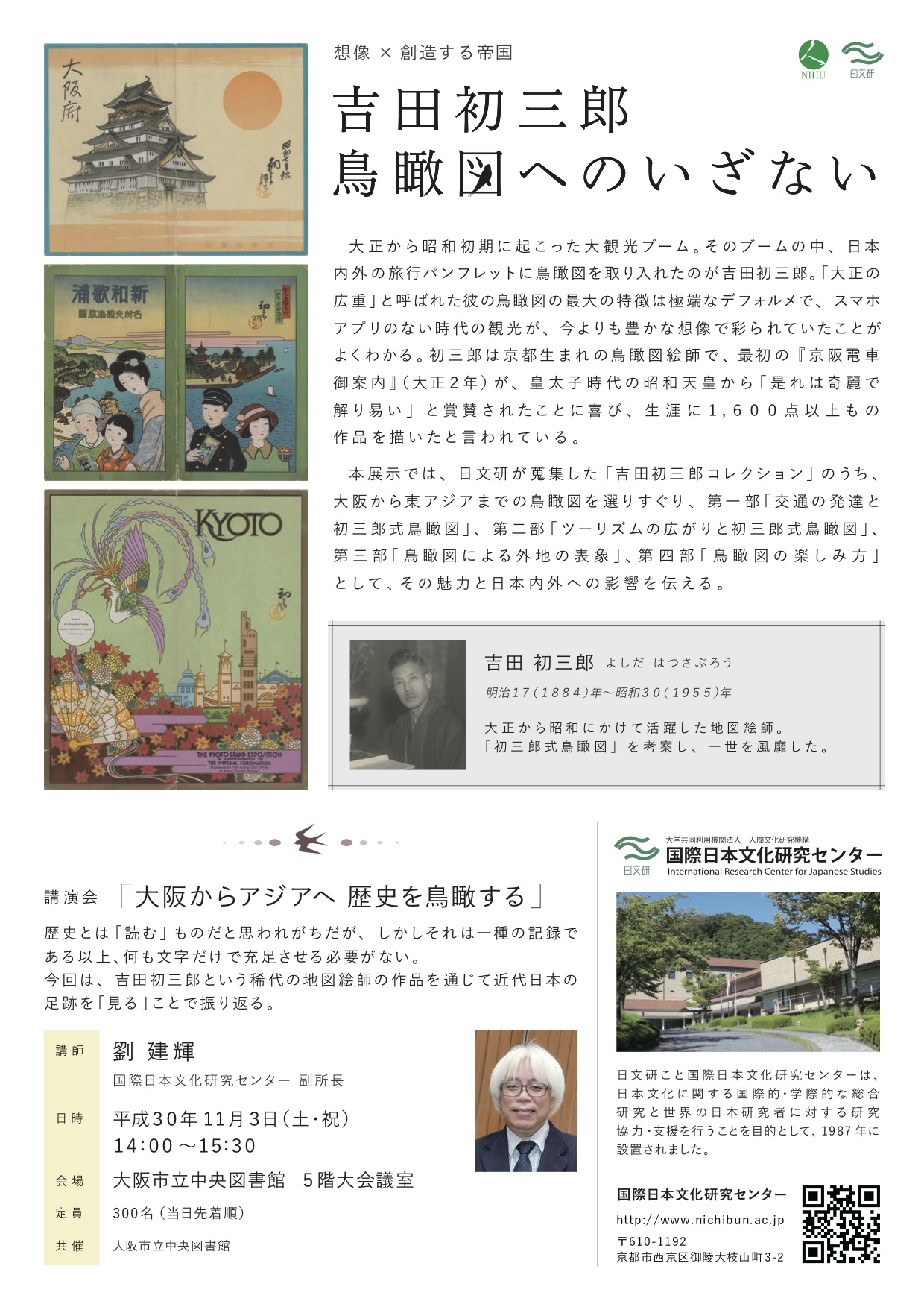 国際日本文化研究センター(日文研)では、このたび大阪市立中央図書館の協力を得て、下記の通り、収蔵資料の展示を開催します。稀代の地図絵師・吉田初三郎(1884-1955)が描いた鳥瞰図を中心に旅行案内や絵葉書など、約60点の日文研所蔵資料を無料でご覧いただきます。11月3日(文化の日)には、展示企画を担当した副所長・劉建輝の講演会も予定しております。○タイトル:「想像×創造する帝国 吉田初三郎鳥瞰図へのいざない」
