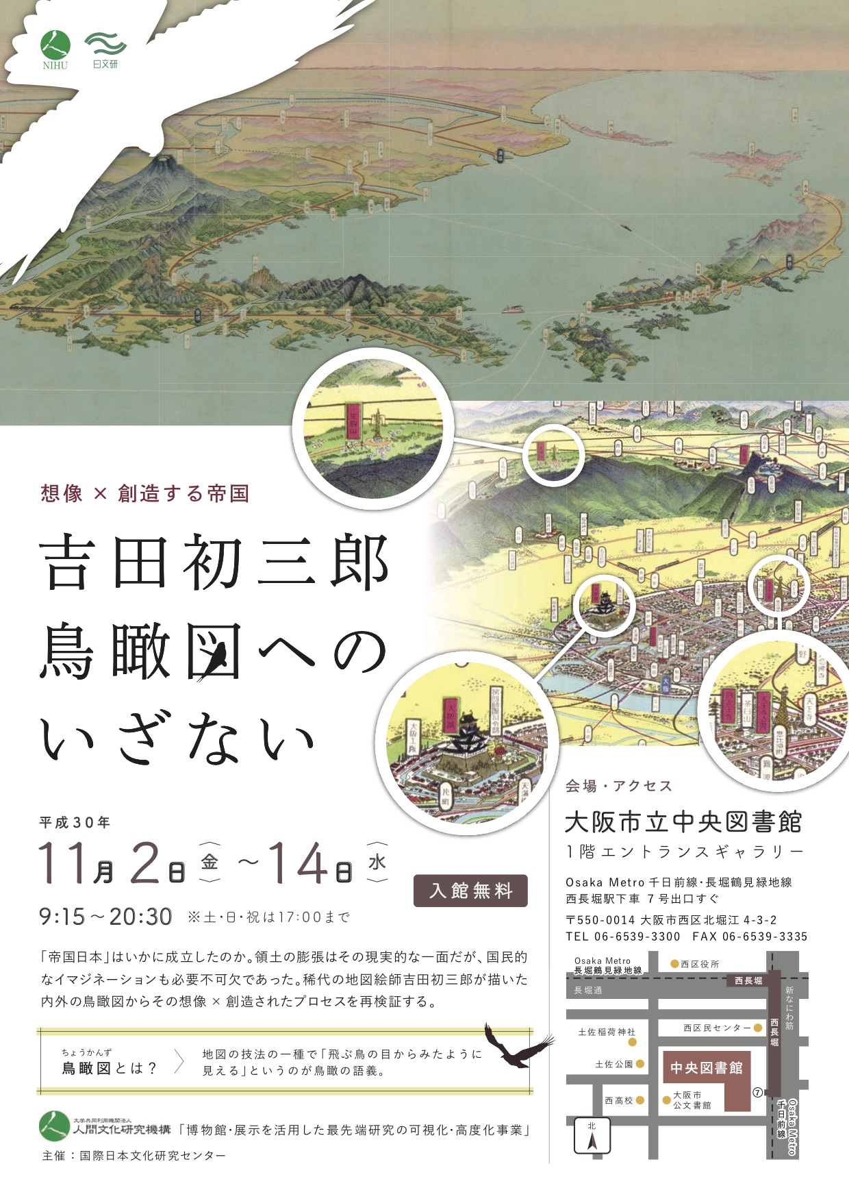 本展示では日文研が蒐集し、データベース化に取り組む「吉田初三郎鳥瞰図コレクション」のうち、大阪・京都そして東アジアの鳥瞰図を選りすぐり、その極彩色の魅力と国内外へ与えた影響をわかりやすくご紹介します。