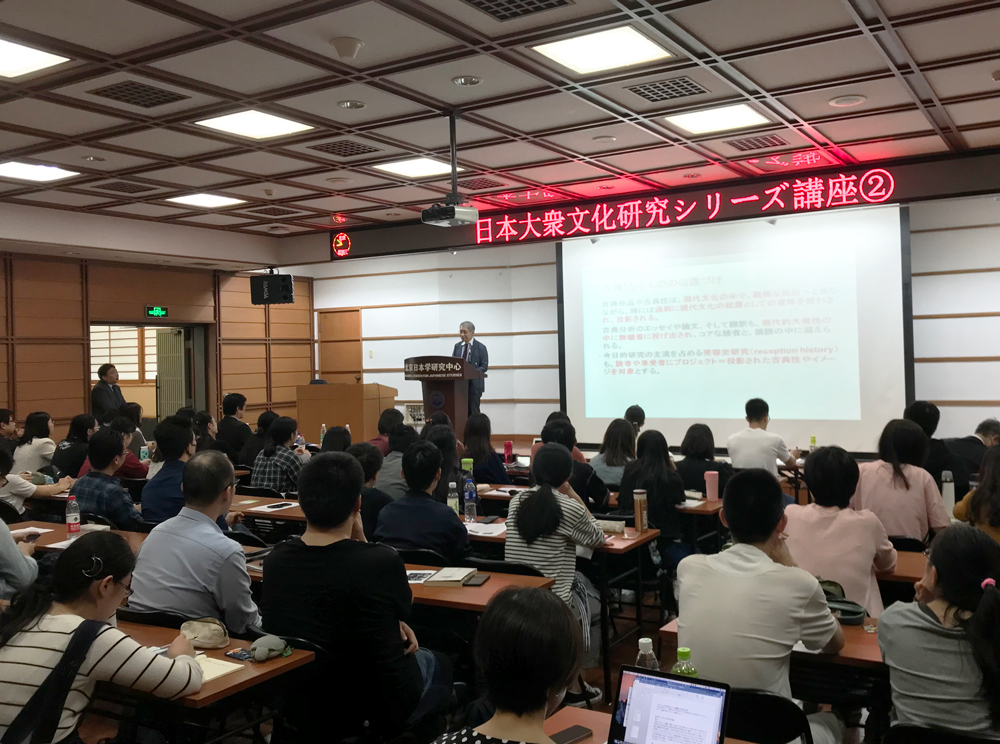 2日目~4日目の連続講座は、清華大学、北京外国語大学、北京師範大学で開催され、日文研の小松和彦所長、荒木浩教授、劉建輝教授、細川周平教授、大塚英志教授、安井眞奈美教授がそれぞれ講義を行いました。連日、講義室は、若い学生たちでほぼ満席となり、各講義のあとには、学生からの活発な質問が寄せられました。