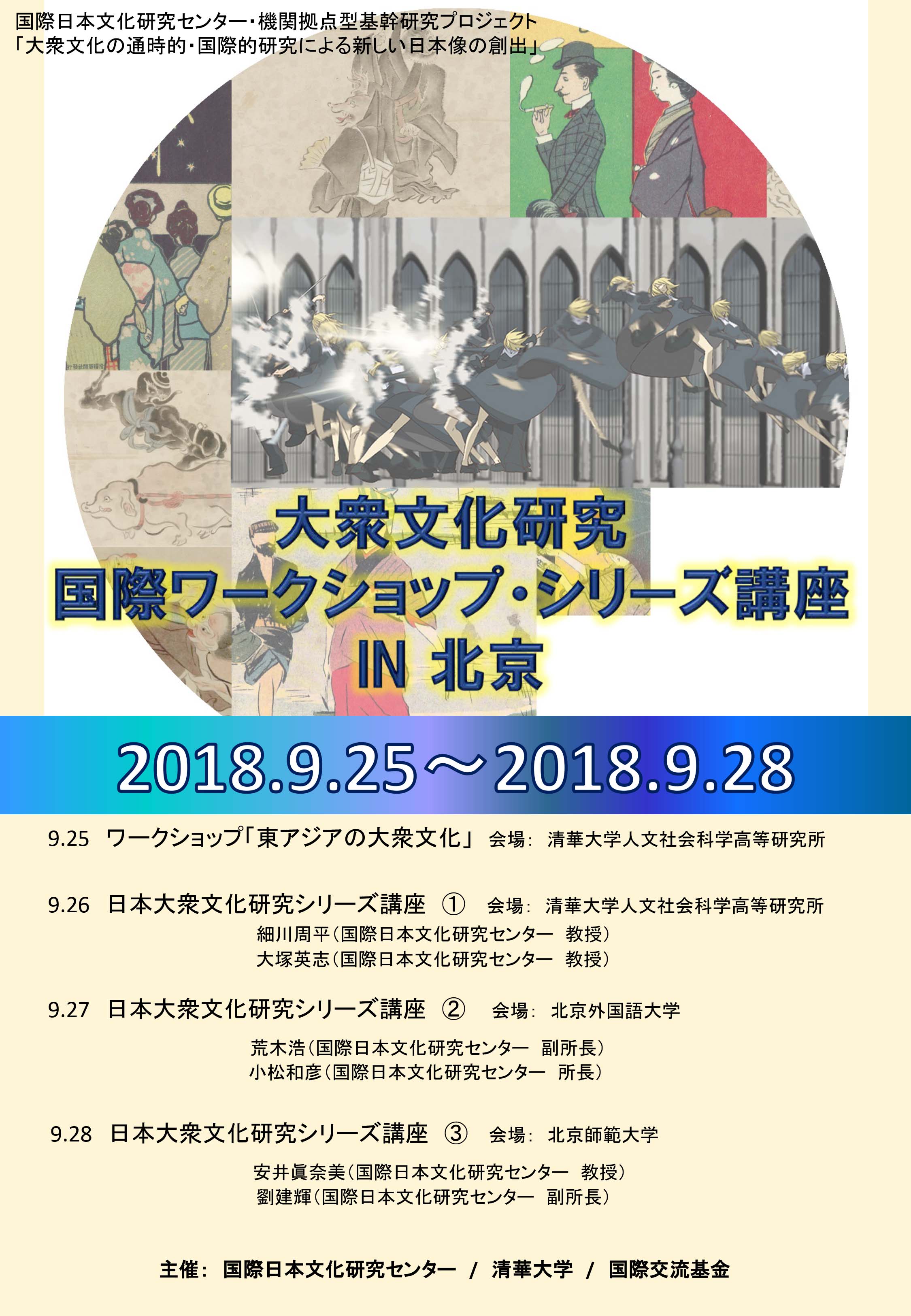 去る9月25日から28日にかけて、北京市において大衆文化研究に関する国際ワークショップ及び連続講座が開催され、日文研の教員が参加しました。この国際ワークショップ及び連続講座は、日文研と、清華大学、国際交流基金、北京外国語大学、北京師範大学が主催・共催したもので、4日間を通して241名の研究者及び大学院生が参加しました。