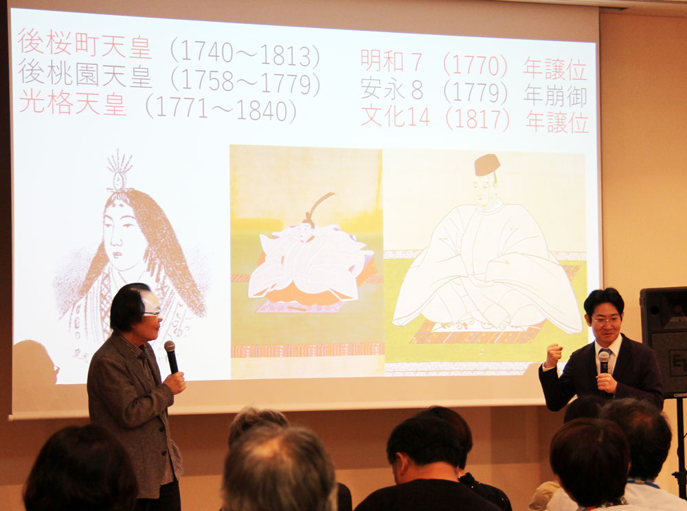日文研出版物の紹介としては、大塚英志教授が、大衆文化研究プロジェクトの成果である編著『翼賛一家と戦時下のメディアミックス』ほか近日刊行予定の2冊について説明しました。その後、所員の研究紹介として、磯田道史准教授が「天皇の譲位・改元をめぐって」と題し、先例となる光格天皇の譲位をめぐる儀式と新年号の発表時期について解説。続いて、井上章一教授との対談が行われました。最後にフレデリック・クレインス准教授が、今夏に公開されたばかりの新サイト「日本関係欧文史料の世界」の利用方法を案内しました。