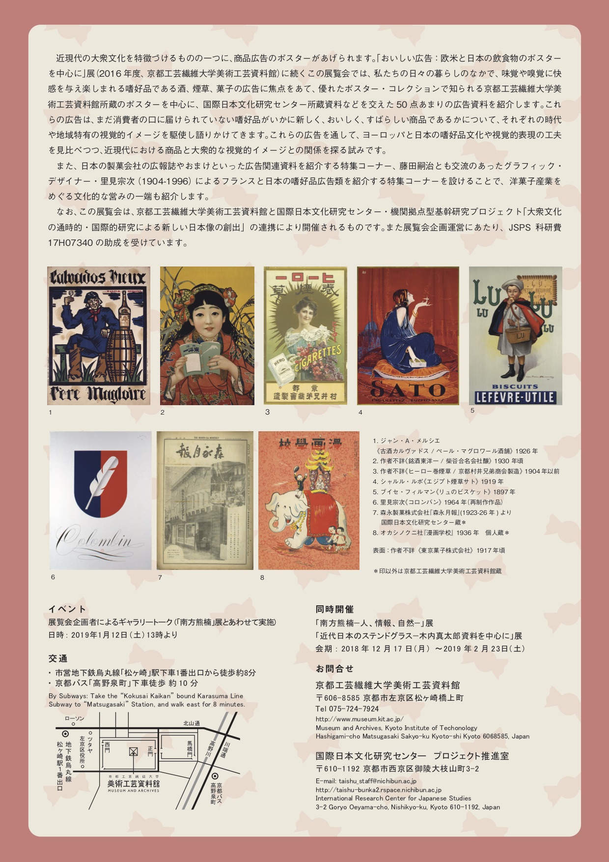 【大衆文化研究プロジェクト・展示】「おいしい広告2 ヨーロッパと日本の酒・煙草・菓子のポスター」を開催します(2018年12月17日~2019年2月23日)