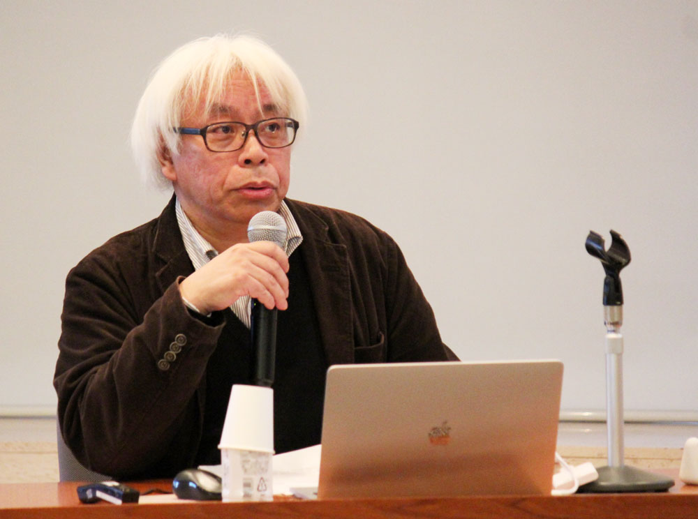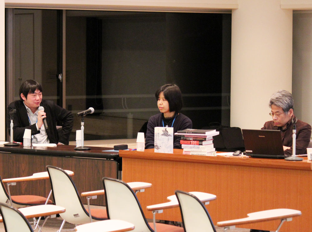 まず大塚英志教授が、共同研究報告書『動員のメディアミックス――〈創作する大衆〉の戦時下・戦後』(大塚英志編、思文閣出版、2017年)誕生に至るまでの共同研究会のテーマや方針の変遷、研究者ネットワーク拡大などの経緯について、丹念に解説しました。発表後には、まんがやサブカルチャー分野では数多い“在野”の研究者が日文研の所蔵資料にアクセスしやすくなるような、よりオープンで手軽な媒体の必要性を訴え、それが真の意味での「学際」だと指摘しました。