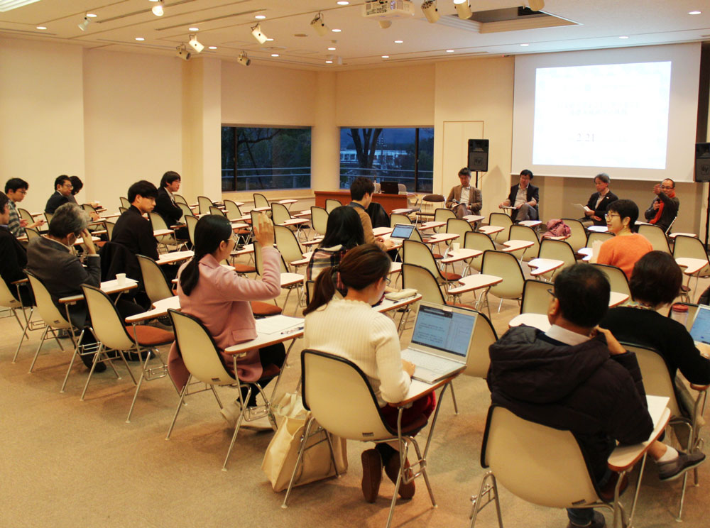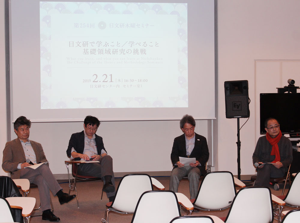 2月21日、「日文研で学ぶこと/学べること 基礎領域研究の挑戦」をテーマに、外部の院生の方々の参加も得て、木曜セミナーが開催されました。「基礎領域研究」の講座を開講している4名の教授が、講座同士の横のつながりを強めるとともに、若い世代への活動紹介と教職員の交流を目的に、それぞれの講座内容について発表し、意見交換を行いました。「基礎領域研究」とは、古文書読解力、外国語の運用、映像資料の解読、文化理論への習熟等、日本文化研究に必要なさまざまな能力を異なる研究者と共有することを目的としたゼミナールです。