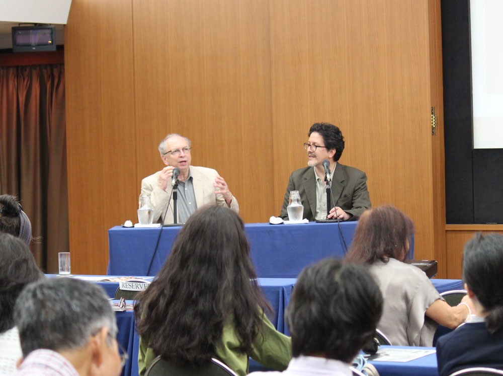 講演後には、自ら能楽師であり、「シアター能楽」の芸術監督も務めるリチャード・エマート氏(武蔵野大学教授)とのディスカッションも行われ、参加者からは「日本の芸能に関する資料と情報の蓄積には目をみはるものがある」と、感嘆の声が聞かれました。