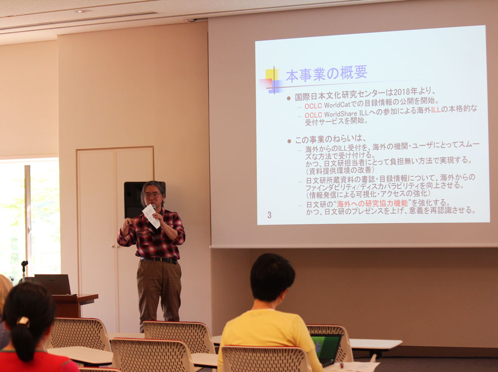 6月20日の木曜セミナーでは、江上敏哲・資料利用係長が、「図書館が日文研と世界をつなぐ」と題し、現在積極的に推進している、OCLCを利用した海外の図書館向けサービスについて紹介しました。OCLC(Online Computer Library Center)とは、アメリカ合衆国の図書館サービス非営利機関で、北米を中心に世界172カ国/地域から72,000以上の図書館が参加しています。日本のほぼ全大学が参加しているNACSIS-CAT(国立情報学研究所[NII]が提供する総合目録・情報データベース)の登録書誌数1,200万件に対し、OCLCの総合目録であるWorldCatの書誌総数は世界最大規模の4億件に上るといいます。しかしながら、日本からの参加は、国立国会図書館や早稲田大学図書館等、ごく少数に止まっているのが現状です。