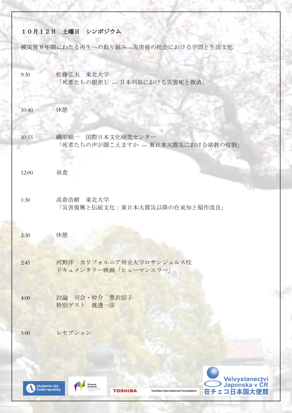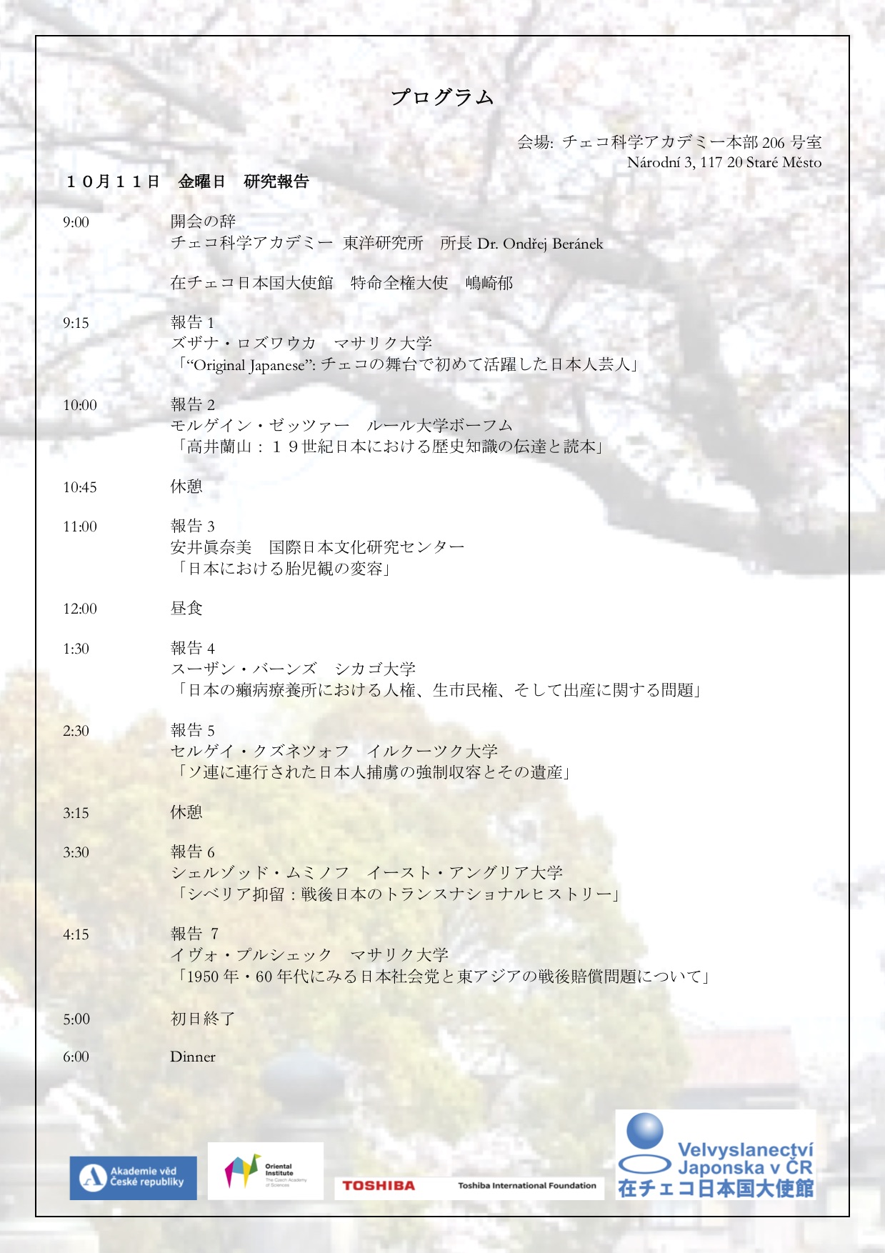 10月から11月初旬にかけて、チェコ共和国首都プラハにあるチェコ科学アカデミーと日文研との間でさまざまな交流活動を進めることができました。以下、報告いたします。10月11、12日に、チェコ科学アカデミー東洋研究所(Oriental Institute of the Czech Academy of Sciences)にて“Crossing Borders: Past and Future of Japanese Studies in the Global Age”と題した、日本・チェコ交流100周年記念プレ・シンポジウムが開催され、日文研からは磯前順一教授と安井眞奈美が発表し、さまざまな研究者と日本研究の現状と今後について議論しました。(プログラム参照)