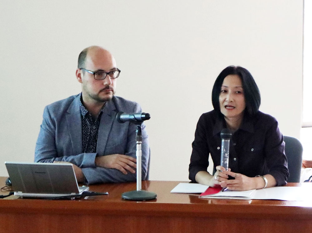 次に、Jakub Hrubý氏と豊沢信子氏が、「中東欧で日本・アジア研究のセンターとなるために:研究連携の意義と展望」(Becoming the center of Japanese/Asian Studies in Central and Eastern Europe: In pursuit of Academic Partnerships)とのテーマで、東アジア部(East Asian Department)について紹介されました。東アジア部は中国研究、日本研究、韓国研究からなり、これまで中国研究がもっとも精力的に進められてきました。
