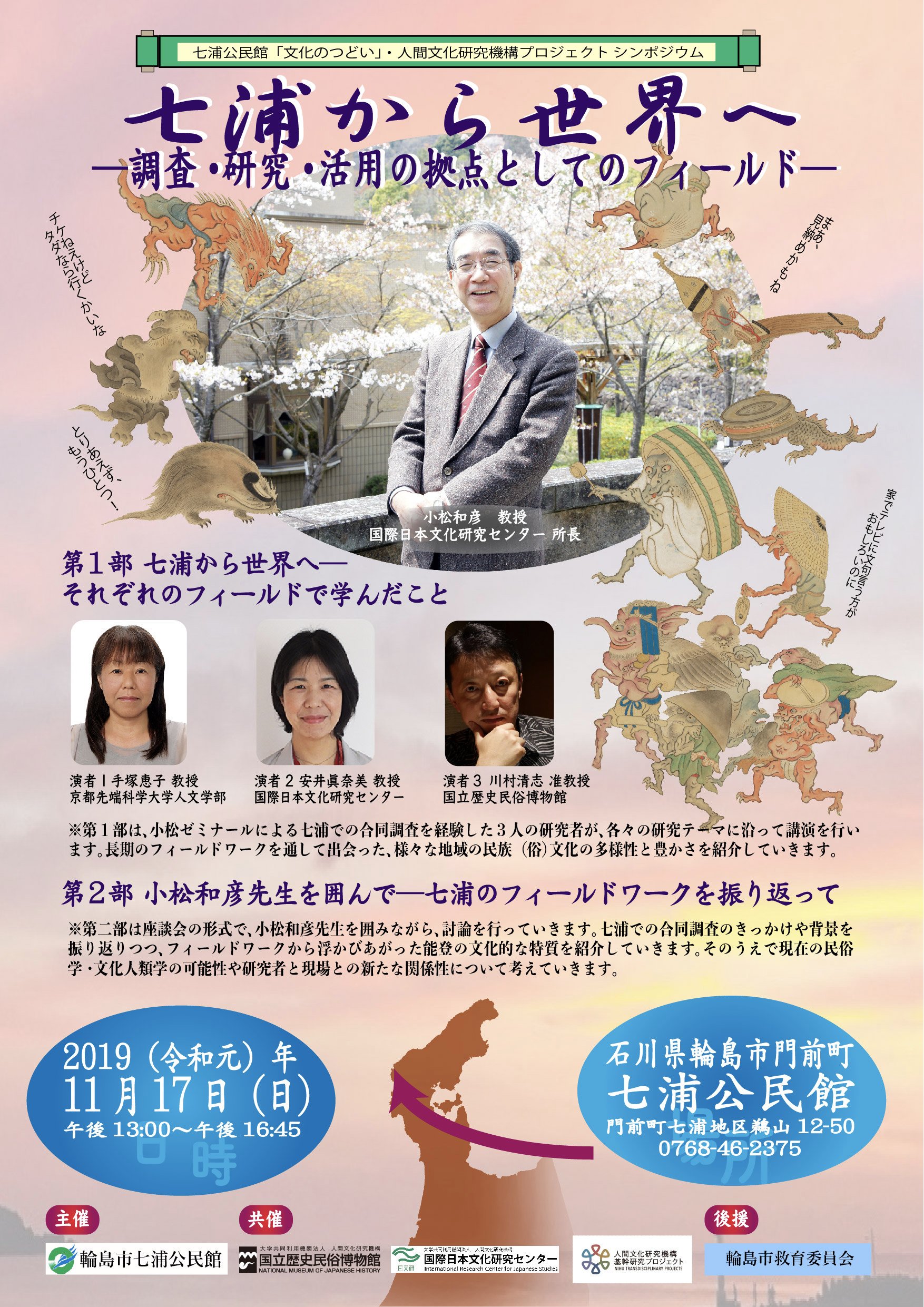 2019年11月17日(日)、輪島市立七浦公民館主催(国際日本文化研究センター他共催)のフォーラム、「七浦から世界へ―調査・研究・活用としてのフィールド―」に日文研から小松和彦所長と安井眞奈美が参加しました。京都先端科学大学の手塚恵子教授、国立歴史民俗博物館の川村清志准教授、安井が、海外調査で得た研究成果などを報告しました。石川県輪島市門前町の七浦地区は、1990年から1992年まで、大阪大学文学部日本学科の民俗学実習(小松和彦阪大准教授(当時)が担当)のフィールドとして、学部生や院生が数多く民俗調査に訪れた場所です。発表者の3人も、当時、学生や院生として民俗学実習に参加していました。今回のフォーラムは、調査を開始して29年を経た今年、小松所長と再び七浦地区を訪れ、これまでの研究成果を七浦の皆さんに向けて発表する貴重な機会となりました。