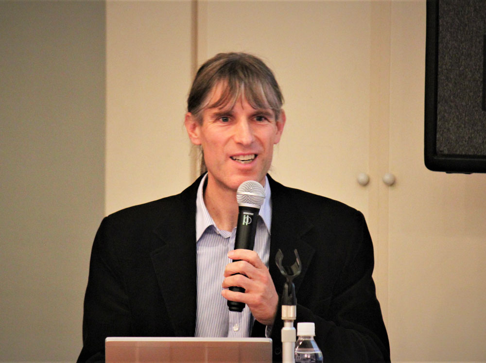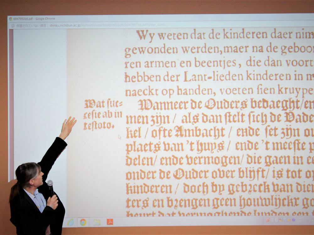 さて、今回のセミナーの口切役は、外書プロジェクトの現プロジェクトリーダーを務めるフレデリック・クレインス准教授。自身が日文研に着任してから現在までのおよそ15年間、「外書」と共に歩んだ日々を振り返り、「外書」のなかでも、とりわけ日本開国期以前に刊行された、延べ500点にも及ぶ日本関係欧文図書・西洋古版日本地図コレクションの概要や特徴、各資料の魅力に言及しました。特に、カロン『日本大王国志』を例とした難解な文字の解読方法や書誌作成にまつわる妙技の話題では、会場に納得と感嘆の吐息が響きました。また、クレインス准教授は現在遂行している外書プロジェクト成果発信ツール「日本関係欧文貴重書データベース」と、Webサイト「日本関係欧文史料の世界」についても、各種コンテンツの内容や、資料の魅力を発信するために講じている工夫、さらに現在の形になるまでに積み重ねてきた改善過程などの事例を交えて紹介しました。