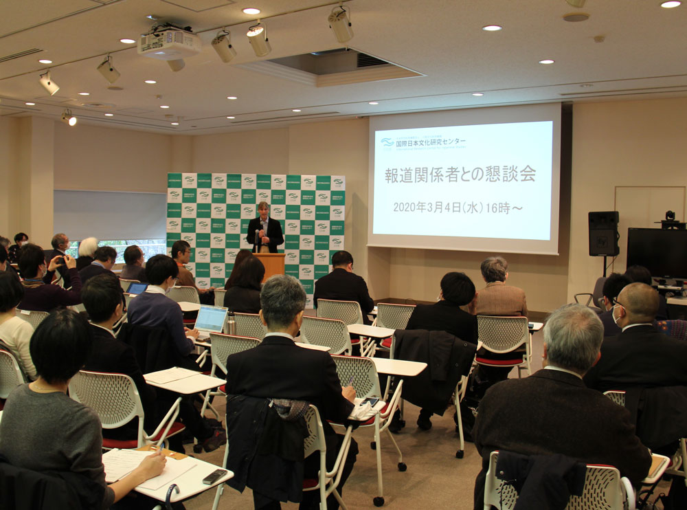3月4日、報道関係者との懇談会を開催しました。同懇談会は、日文研の研究活動や最新の成果、重点的取り組みなどを紹介して理解を深めてもらうと同時に、広く社会へ情報発信することを目的に年3回開催されています。58回目となる今回は、新聞社、テレビ局、出版社、地域広報等12機関の関係者と所内教職員、計57名が出席しました。まず、最近着任の2名の外国人研究員の紹介、および今年度後半に開催されたシンポジウムや講演会等の活動報告に続き、5月末に開催が予定されている現所長・小松和彦教授の退任記念講演会や、大衆文化研究プロジェクト関連の活動予定が紹介されました。3月以降に刊行予定の出版物としては、『梅原猛先生追悼集―天翔ける心』(国際日本文化研究センター・非売品)、「国際日本研究」コンソーシアム記録集の第3弾『越境する歴史学と世界文学』(臨川書店)、『明智光秀と細川ガラシャ』(筑摩書房)、『まんが訳絵巻 酒呑童子』(ちくま新書)等の案内がありました。