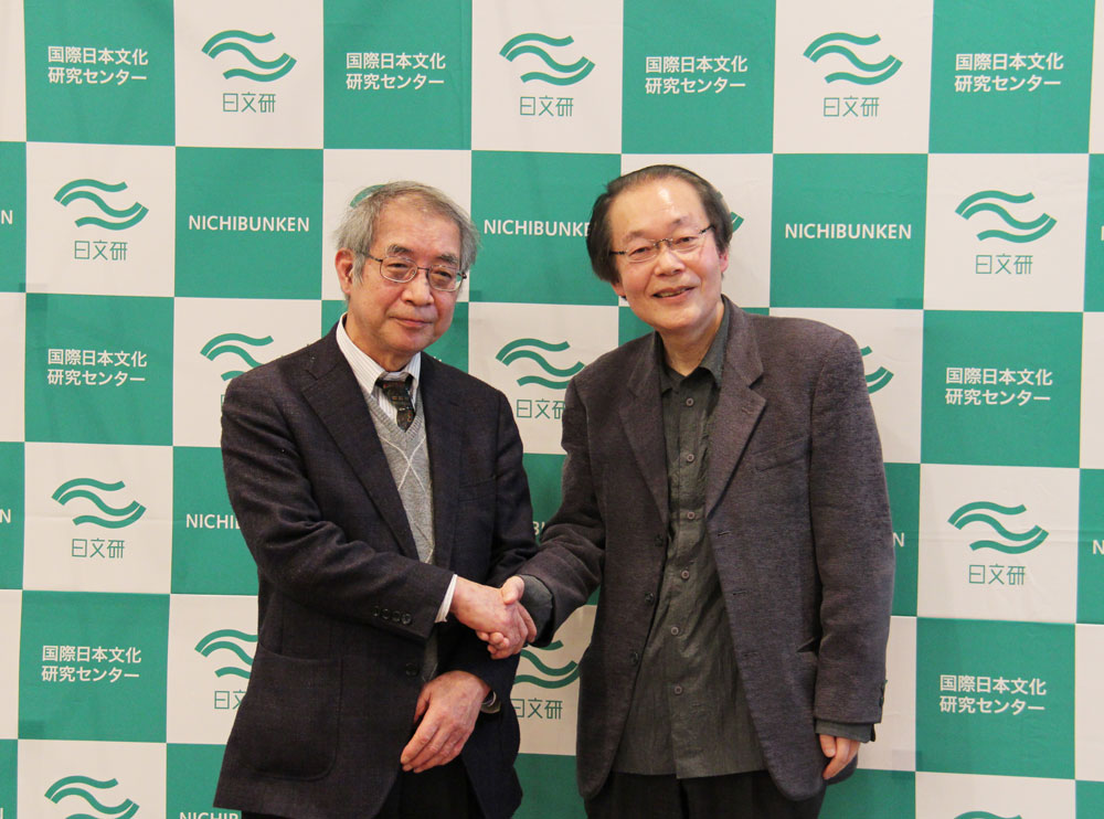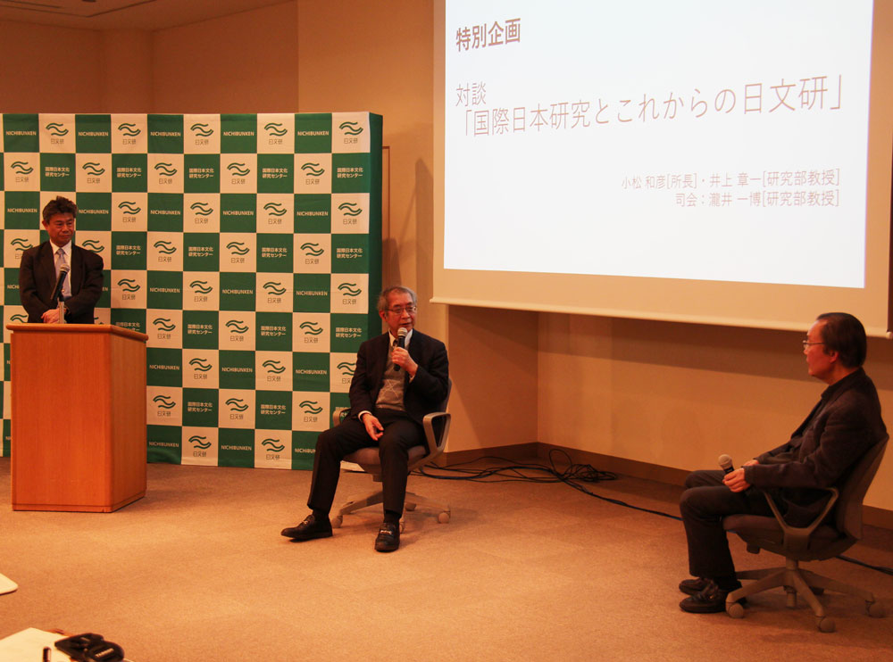 最後に特別企画として、3月で退任する小松和彦所長と次期所長となる井上章一教授が、「国際日本研究とこれからの日文研」をテーマに対談を行いました。着任当初と現在の日文研の姿を比較しつつ、日本文化を客観的に外からみる研究姿勢の重要性を語り合い、4月に始動する新体制に向けて小松所長から温かなエールが送られました。