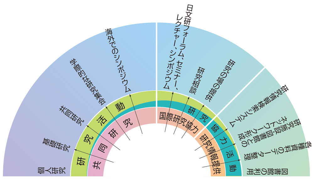 - 1日文研は、国際的・学際的・総合的な観点から、日本文化に関する研究課題を設け、国内外から参加する様々な分野の研究者による共同研究に取り組んでいます。