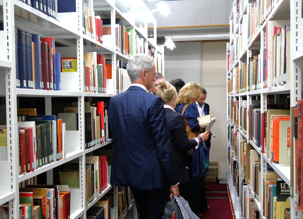 井上章一所長(日文研)をはじめとする日文研教員との懇談では、7月に日文研で開催し、アムステルダム自由大学からも参加いただいた国際シンポジウムの報告に続き、共同研究や研究プロジェクトなど、今後の研究交流について活発な意見交換が行われました。続いて、図書館を見学し、学長らは蔵書数やオランダ語で書かれた書物などに大変感銘を受けられていました。