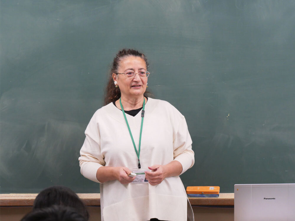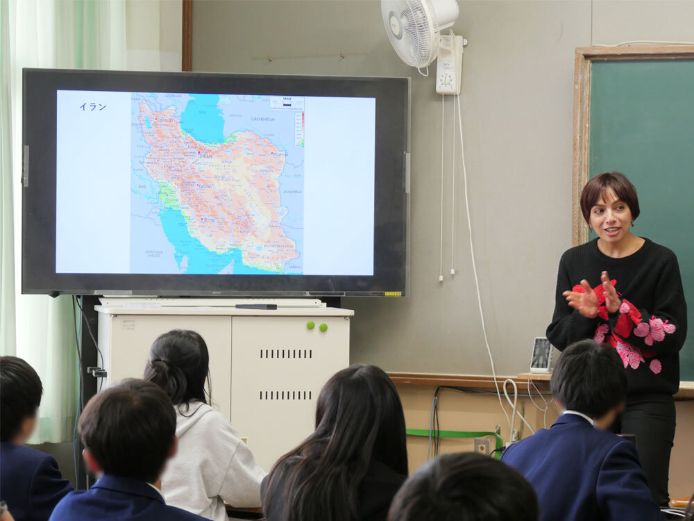 日文研における地域貢献活動の一環として、隣接する京都市立大枝中学校の2年生に出前授業を行いました。今回は、講師をザヘラ・モハッラミプール特任助教、マリア・グラツィア・ペトルッチ外国人研究員、孫波外国人研究員の3名が務め、各教室で授業を行いました。生徒の皆さんによる各講師の出身国をテーマとした発表が行われた後、講師自身が出身国の紹介や日本に来た理由、日本に来て嬉しかったこと・困ったことなどを語りました。生徒の皆さんは、外国と日本の文化の違いや講師の経験談を熱心に聞き入り、質疑応答など積極的に授業に参加する様子が見られました。最後に記念撮影を行い、交流を深めました。