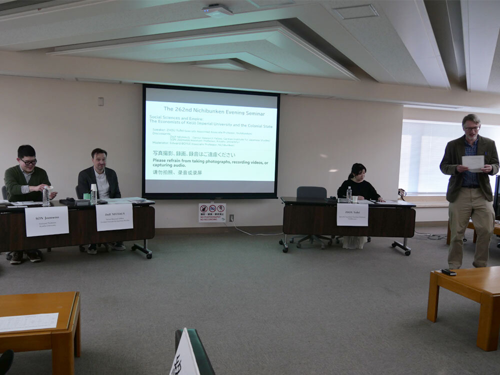 2026年1月22日(木)、第262回イブニングセミナーを開催しました。発表者は、周雨霏特任准教授(日文研)、ディスカッサントはドルフ・ノイハウス氏(ドイツ日本研究所専任研究員)とソン・ジュンウ氏(九州大学助教)、司会をエドワード・ボイル准教授(日文研)が務めました。