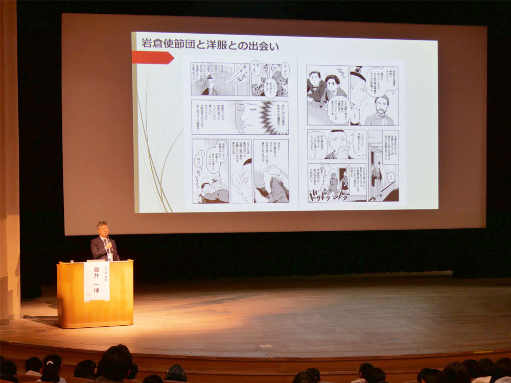 瀧井教授は、自身が監修した「岩倉マンガ」を軸に日本の憲法が西洋文明との出会いの中でどのように形づくられてきたのか、また外国の文化を学びながらそれらを自らの手で作り、独自の文化として発展させてきた歴史について、洋食、洋服やドレス等の豊富な例を交えて語られました。