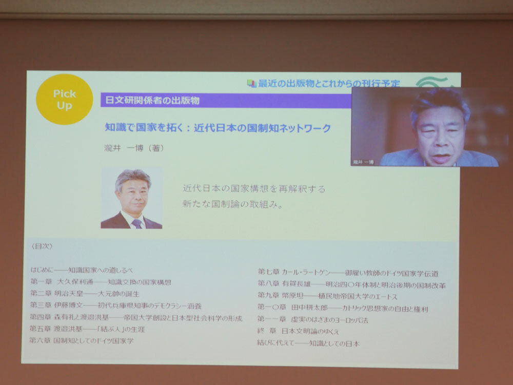 次のコーナーでは、戦教授(同副室長)より直近の日文研出版物が紹介され、ボイル准教授、ホワイト特任助教、スクリーチ教授、劉建輝教授、瀧井教授がそれぞれ、自身の出版物の魅力について語りました。